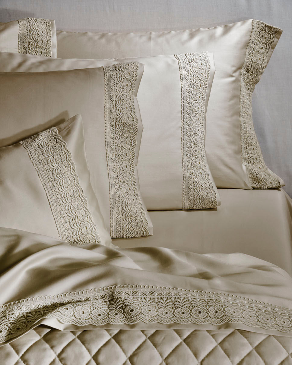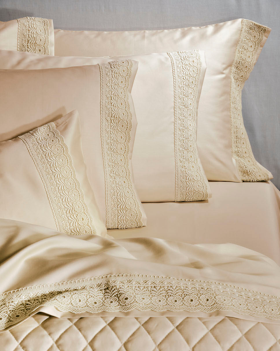 Set çarçafësh elegant në ngjyrë bezhë, i zbukuruar me detaje të punuara me dantellë fine...