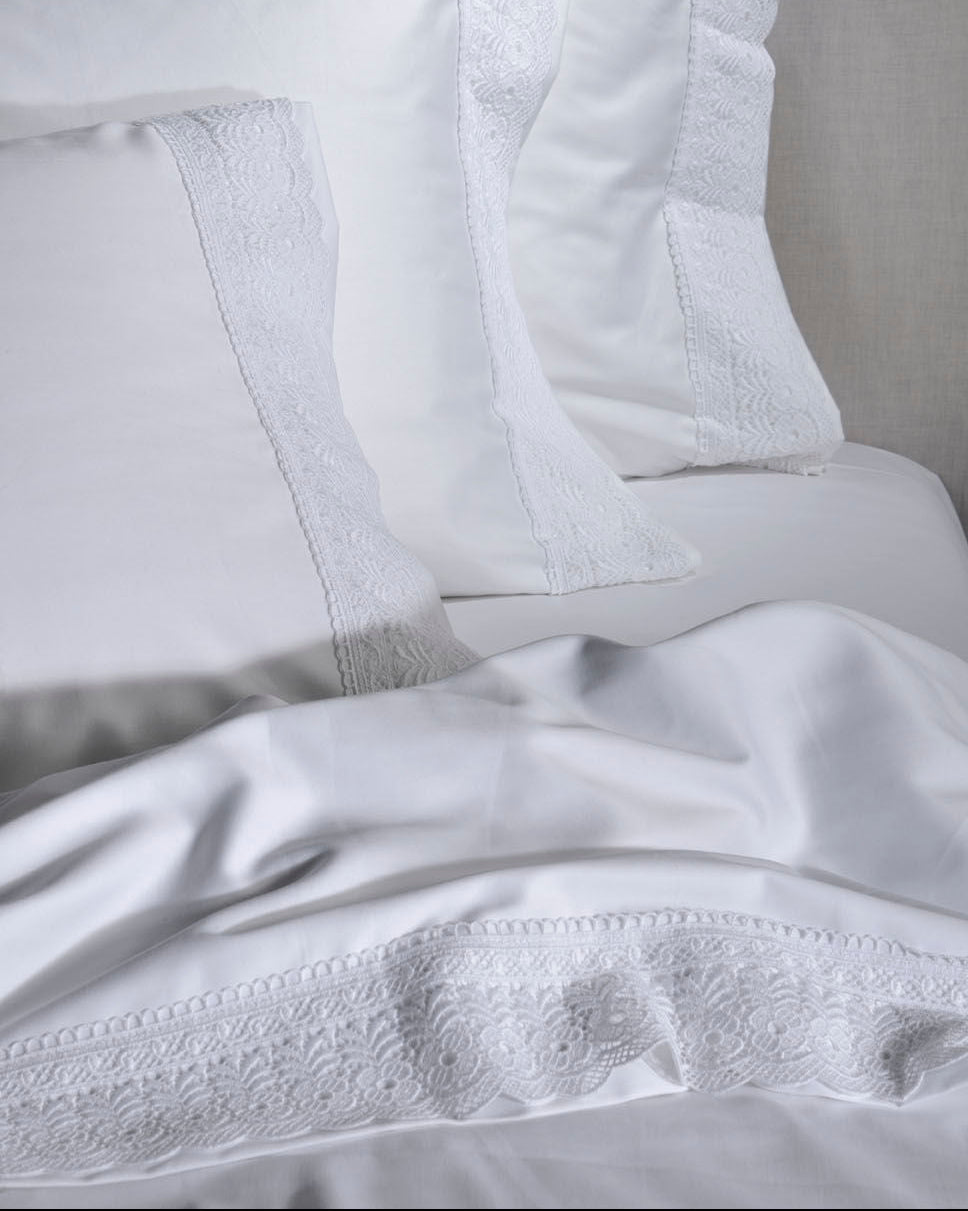 Set çarçafësh elegant në ngjyrë të bardhë, i zbukuruar me detaje të punuara me dantellë...