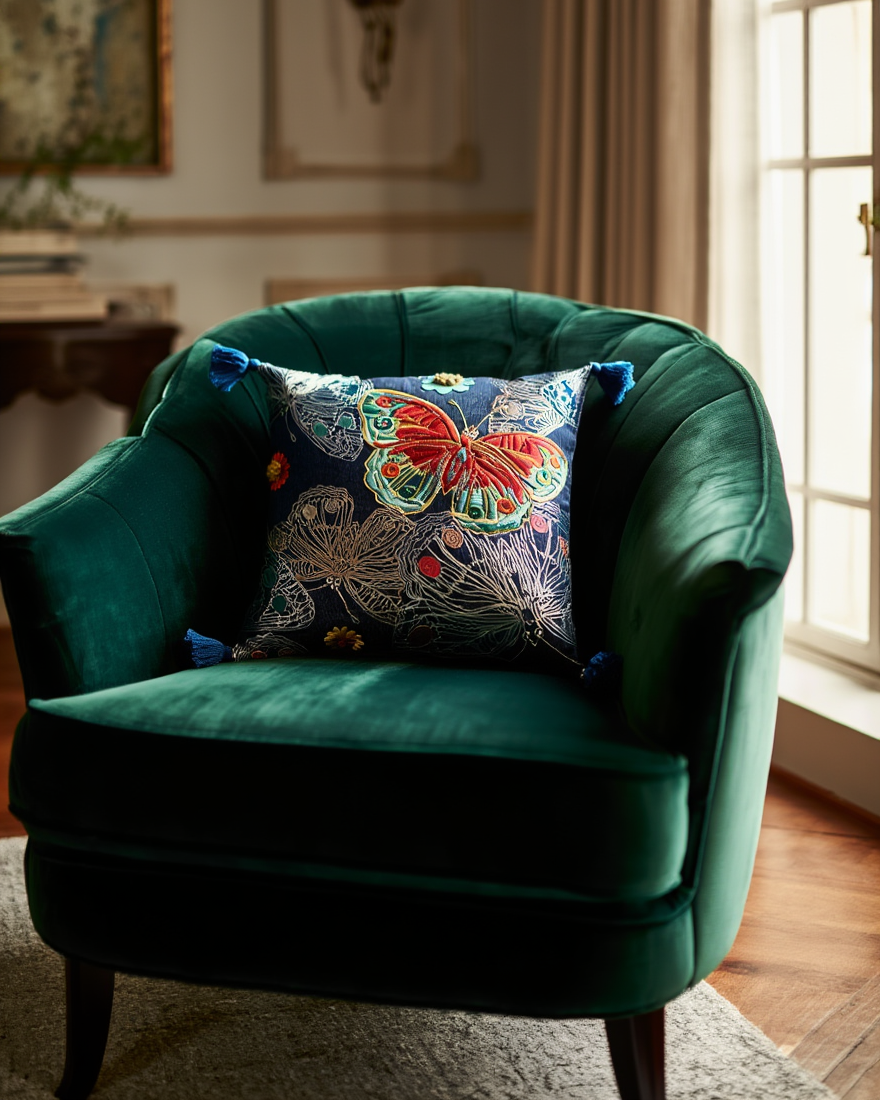 Shtoni ngjyra dhe gjallëri në ambientin tuaj me këtë jastëk dekorativ me flutura të qëndisura....