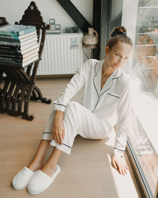 Zgjohu me stil dhe rehati! Pizhama jonë klasike në ngjyrë të bardhë me detaje elegante...