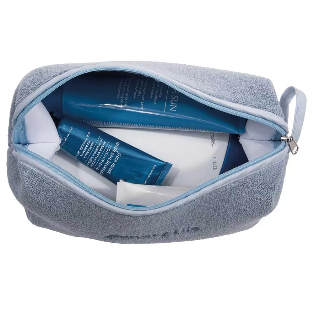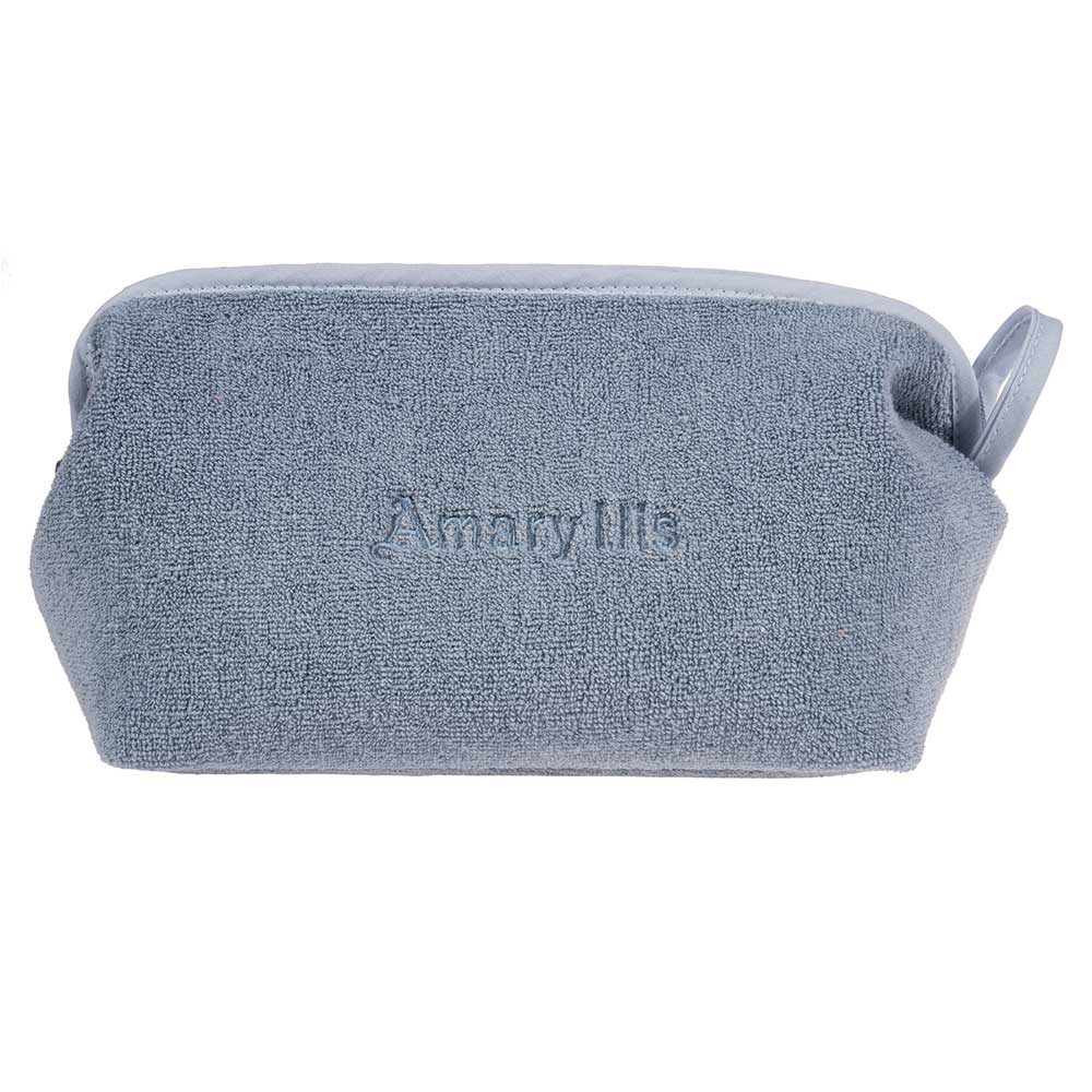 Çantë tualeti e madhe në ngjyrë blu e çelët, prej materiali peshqir