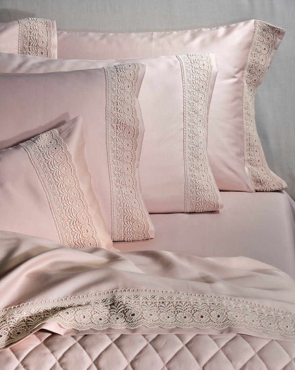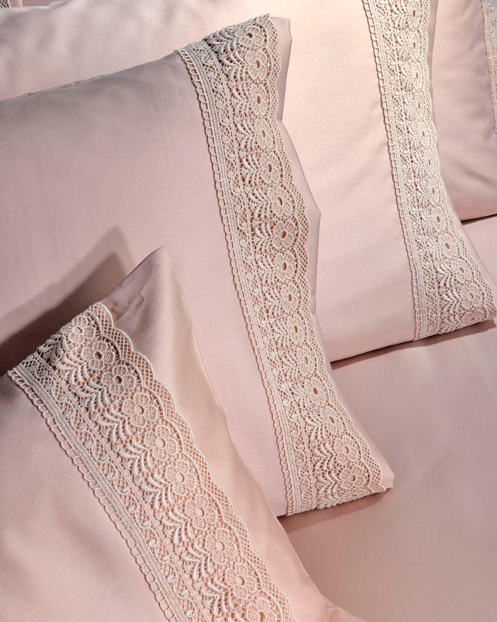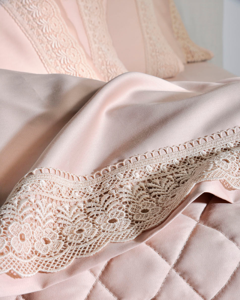 Set çarçafësh elegant në ngjyrë rozë të butë, i zbukuruar me detaje të punuara me dantellë fine që i japin një pamje romantike dhe të rafinuar dhomës së gjumit.