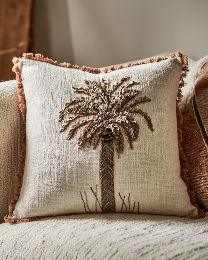 Shtoni një prekje tropikale dhe elegante në ambientin tuaj me jastëkun dekorativ “Beige Palm Tree Phoenix”. I punuar me detaje reliev dhe ngjyra natyrale bezhë, ky jastëk sjell ngrohtësi dhe stil në çdo hapësirë. Ideale për divan, kolltuk apo dhomën e gjumit, është kombinimi perfekt i dizajnit boho dhe atmosferës bregdetare.
