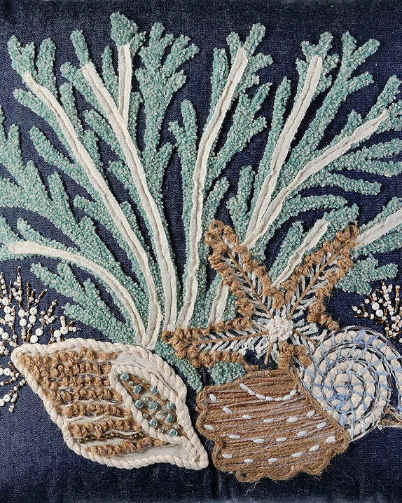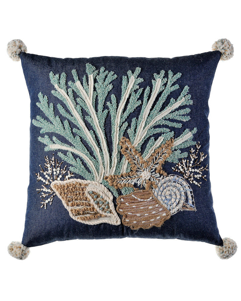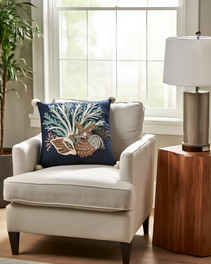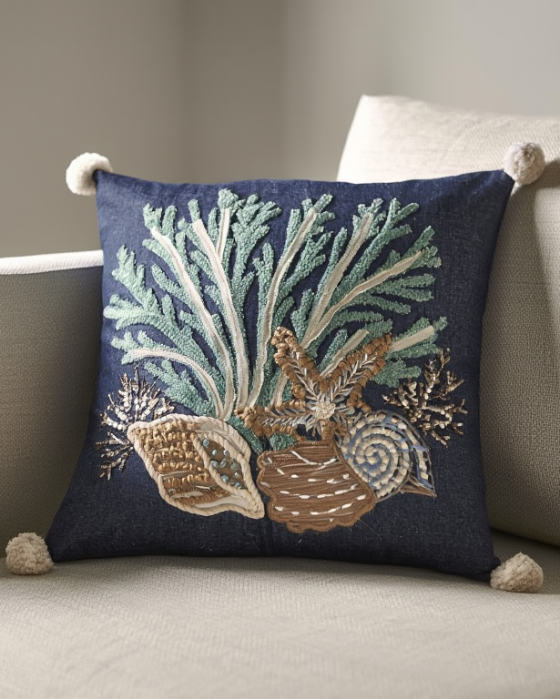 Ky jastëk unik është punuar me detaje të qëndisura me motive detare si korale, yll deti dhe guaska, mbi një sfond blu të errët elegant. I përsosur për ambientet bregdetare, pushimore apo për t’i dhënë një prekje verore çdo dhome.