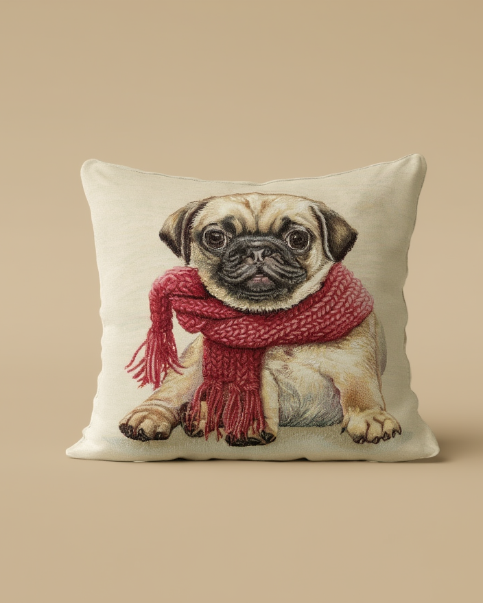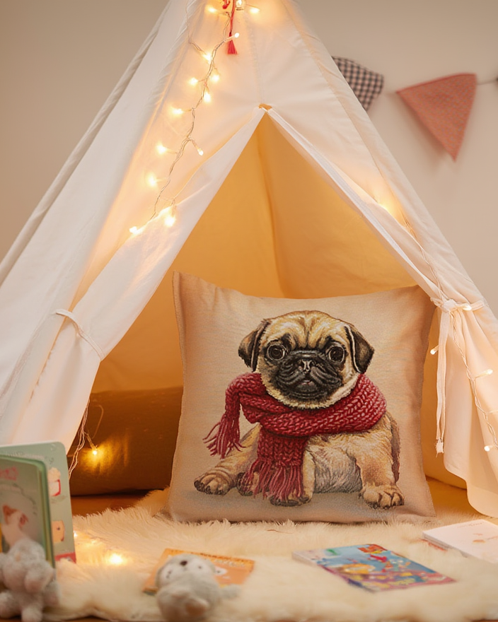 Ky jastëk dekorativ me ilustrim të ëmbël të një qeni sjell menjëherë ndjesi ngrohtësie dhe rehatie në çdo ambient. Dizajni i veçantë me shall krijon një atmosferë mikpritëse dhe të këndshme, perfekte për dhomën e ndenjjes, dhomën e fëmijëve apo këndin e leximit. Ngjyrat e buta dhe stili ilustrativ e bëjnë të lehtë për t’u kombinuar me dekore të ndryshme, duke shtuar karakter dhe personalitet në hapësirë.