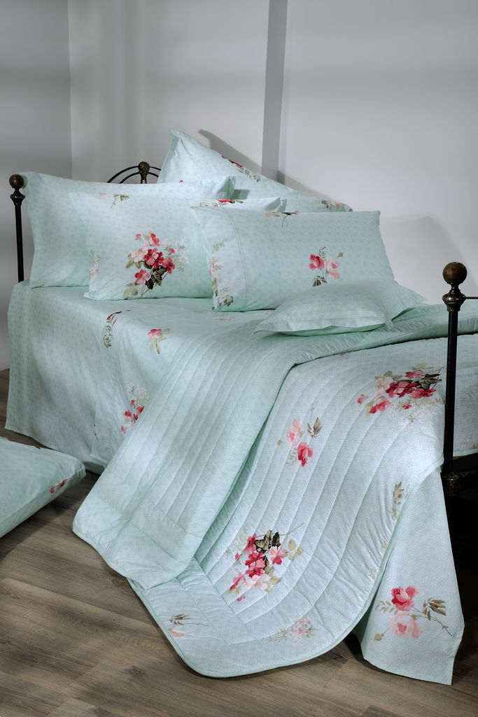 Përshkrimi: Set çarçafi zarf dopio, i cili përbëhet nga 1 çarçaf zarf me përmasë 235x245 dhe 2 këllëf jastëku me përmasë 52x75