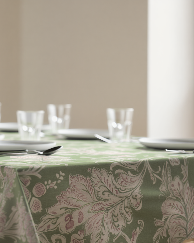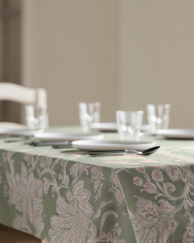 Mbulese tavoline me dizajn klasik floral në nuanca jeshile dhe motive elegante në rozë të zbehur e bezhë. E punuar me kujdes nga material cilësor, kjo mbulesë sjell një atmosferë të ngrohtë dhe plot finesë në ambientin tuaj. Ideale për përdorim të përditshëm apo raste të veçanta, ajo i jep tryezës tuaj një prekje romantike dhe të rafinuar.