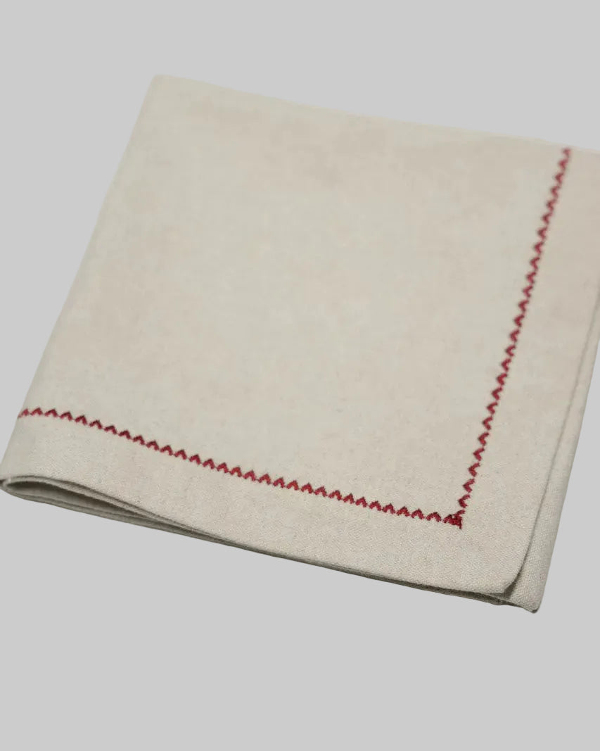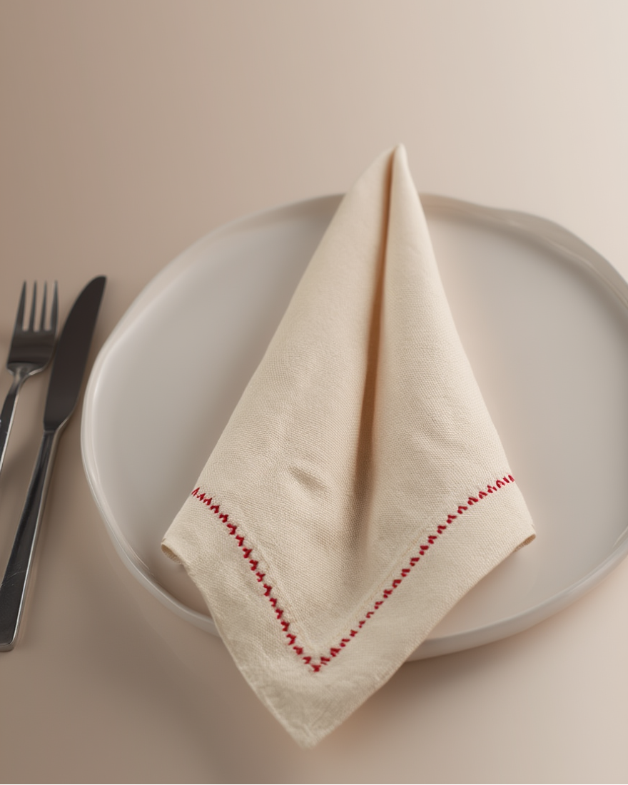 Pecetë tavoline elegante në ngjyrë natyrale, e zbukuruar me qëndisje të kuqe që i jep një prekje klasike dhe të rafinuar çdo tryeze. Materiali i butë dhe pamja minimaliste e bëjnë të përshtatshme si për përdorim të përditshëm, ashtu edhe për tavolina festive apo momente të veçanta. Kombinohet lehtësisht me mbulesa dhe aksesorë të ndryshëm, duke krijuar një atmosferë të ngrohtë dhe mikpritëse në çdo vakt.