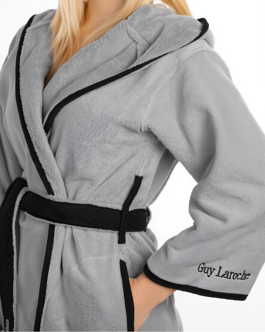 Robdishan elegant për femra nga Guy Laroche, i dizajnuar për të kombinuar stilin modern me rehatinë maksimale. I punuar nga material i butë dhe përthithës, ofron ndjesi të këndshme në lëkurë dhe rehati pas dushit apo gjatë momenteve të relaksit në shtëpi. Modeli me kapuç, xhepa anësorë dhe rrip në bel siguron përshtatje praktike dhe pamje elegante, ndërsa gjatësia mbi gju i jep një stil bashkëkohor. Zgjedhja ideale për ata që kërkojnë cilësi dhe finesë me firmën Guy Laroche.