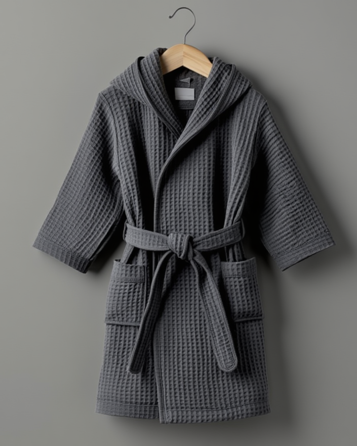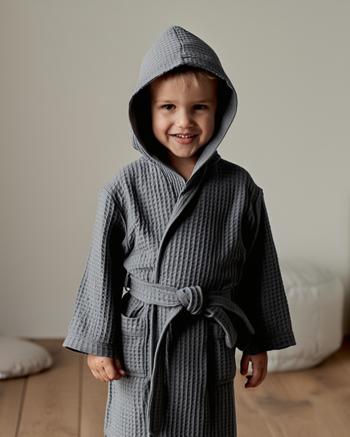 Robdishani për fëmijë nga pambuku me endje waffle ofron butësi, thithje të mirë të lagështisë dhe rehati pas banjos. I lehtë, i ajrosshëm dhe me dizajn modern, është zgjedhja perfekte për përdorim të përditshëm gjatë gjithë vitit.