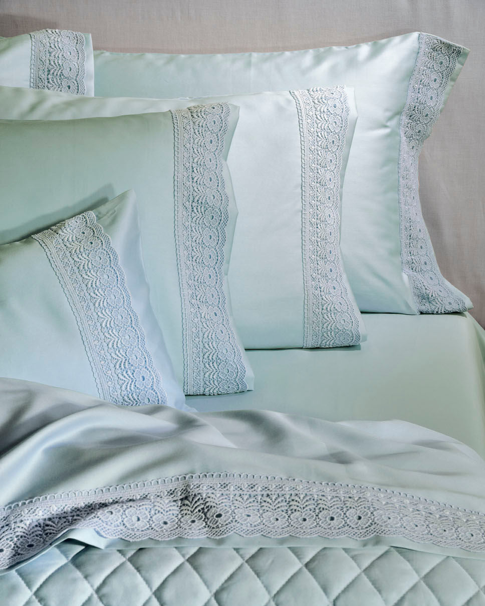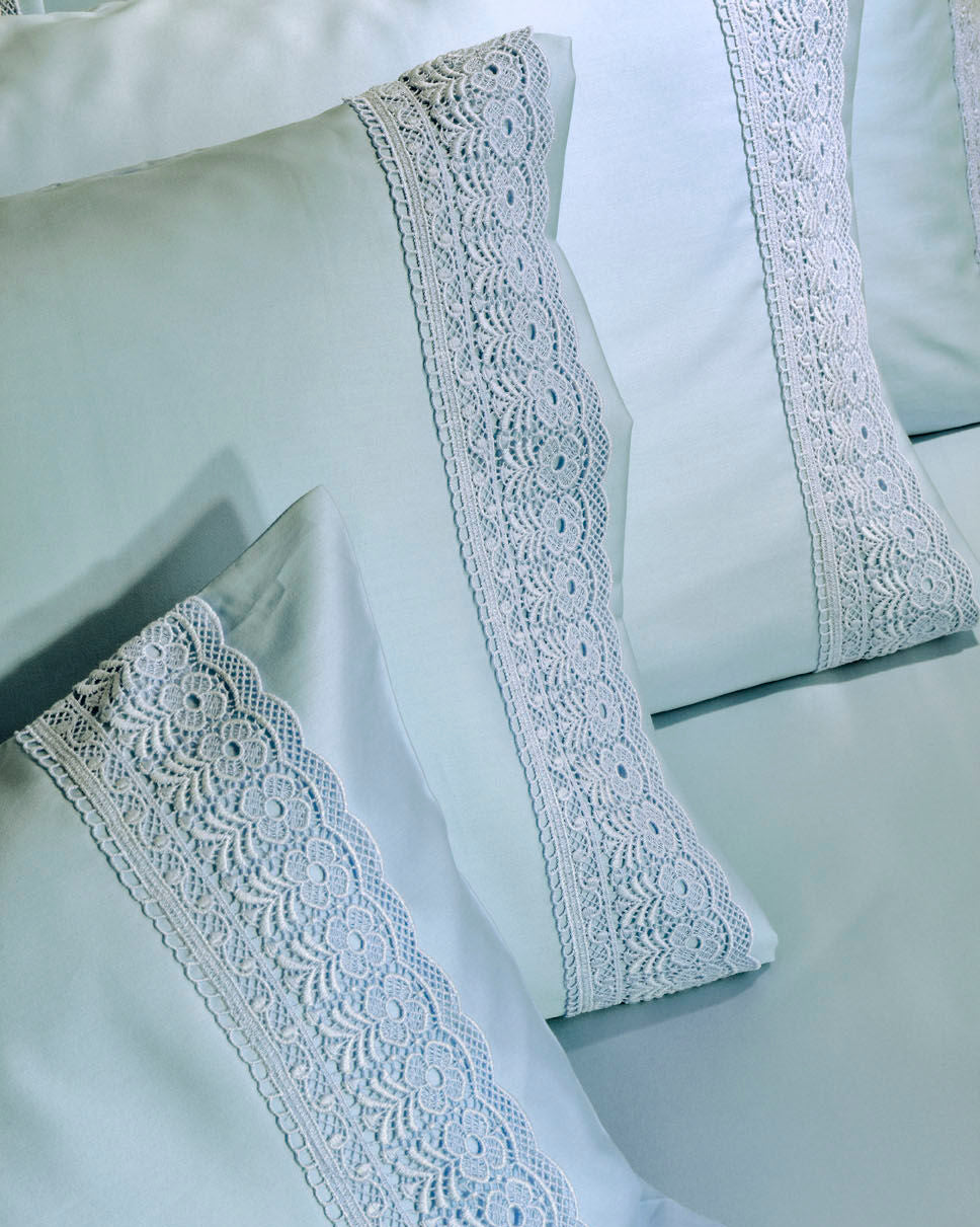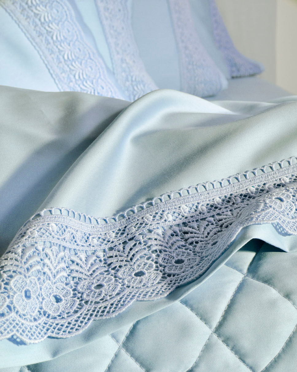 Set çarçafësh elegant në ngjyrë bojëqielli të butë, i zbukuruar me detaje të punuara me dantellë fine që i japin një pamje romantike dhe të rafinuar dhomës së gjumit.