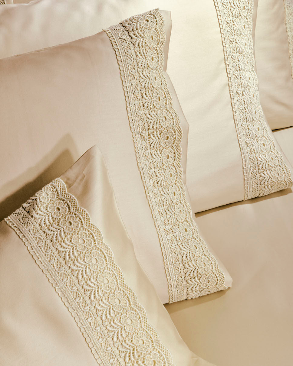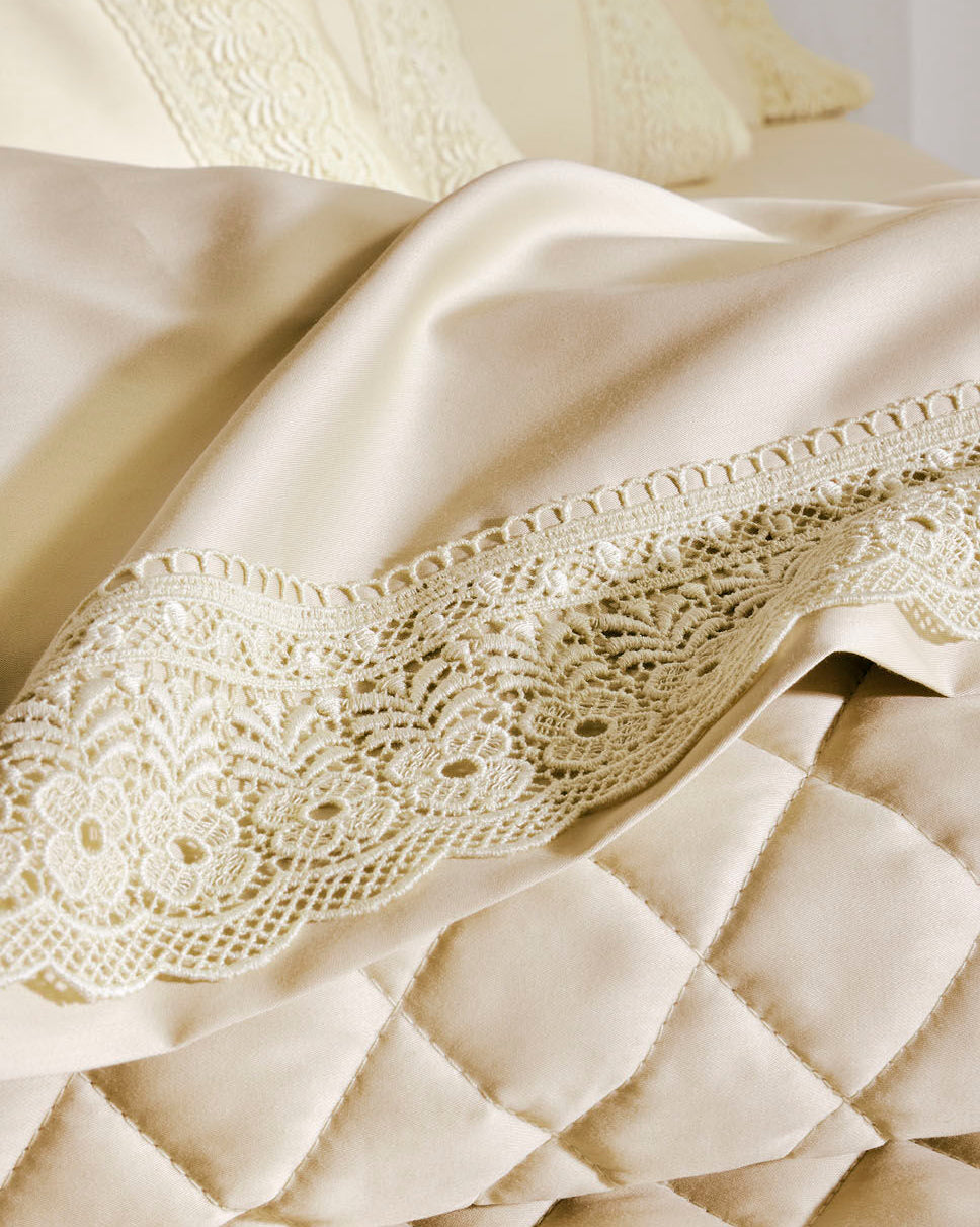 Set çarçafësh elegant në ngjyrë pana, i zbukuruar me detaje të punuara me dantellë fine që i japin një pamje romantike dhe të rafinuar dhomës së gjumit.