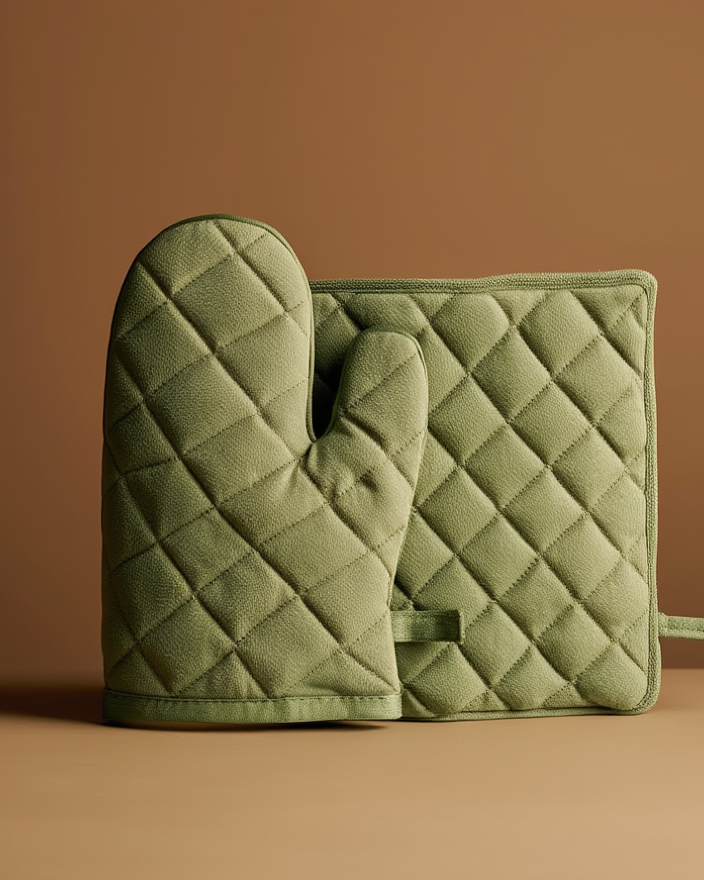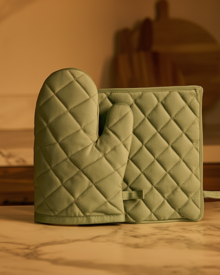 Shtoni siguri dhe stil në kuzhinën tuaj me këtë set praktik dhe elegant. Përfshin një dorashkë për furrë dhe një nën tenxhere të punuar me material të qëndrueshëm, me mbushje të trashë për mbrojtje maksimale nga nxehtësia. Ngjyra jeshile i jep një pamje të ngrohtë çdo ambienti. Ideale për përditshmëri apo për raste të veçanta në kuzhinë. Me dizajn të qepur me forma rombi, është një aksesor funksional dhe dekorativ njëkohësisht.