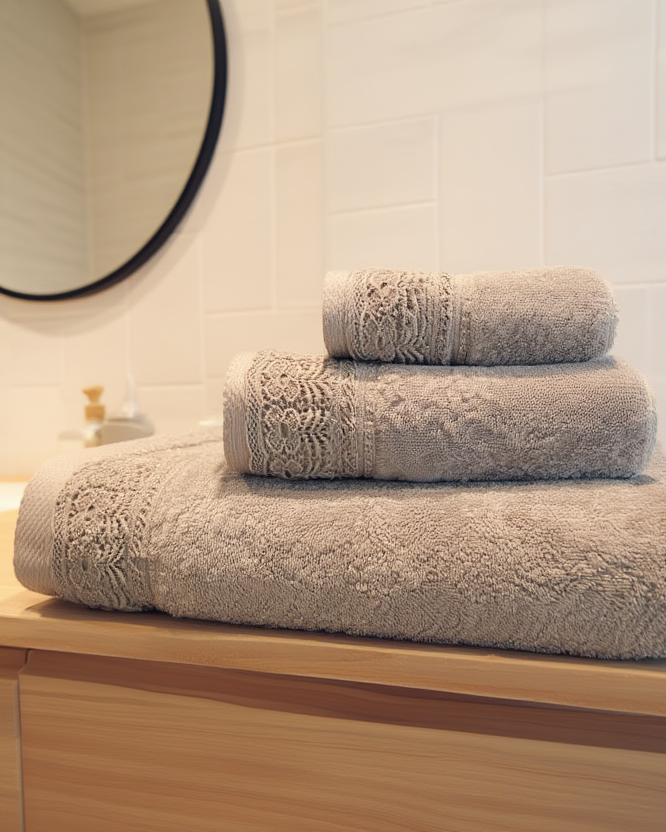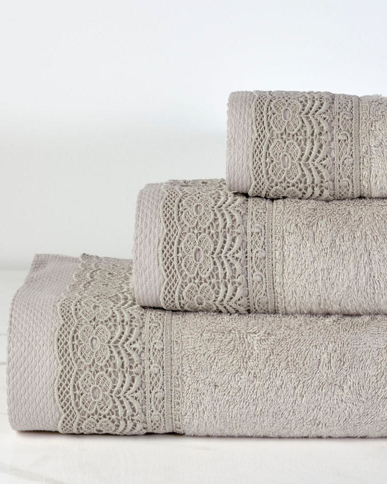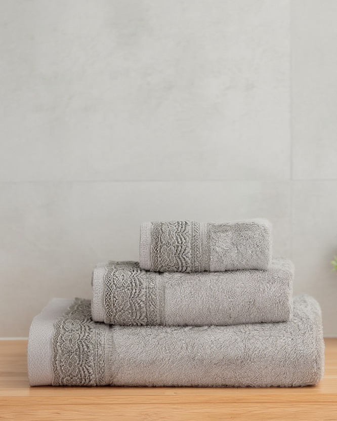 Set peshqirësh elegant me dizajn romantik dhe të rafinuar, ideal për të shtuar një prekje luksi në çdo banjo. I përbërë nga tre pjesë me madhësi të ndryshme, ( peshqir duarsh 30x50, peshqir fytyre 50x90 dhe peshqir trupi 70x140 ), ky set dallohet për dantellën dekorative fine që i jep një pamje klasike dhe delikate.