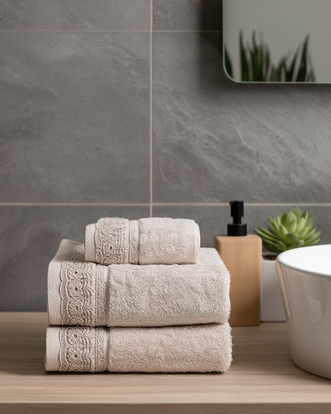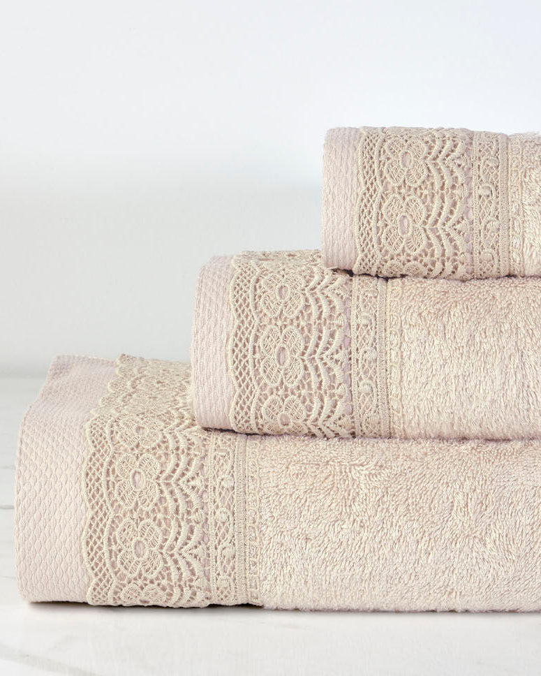 Set peshqirësh elegant me dizajn romantik dhe të rafinuar, ideal për të shtuar një prekje luksi në çdo banjo. I përbërë nga tre pjesë me madhësi të ndryshme, ( peshqir duarsh 30x50, peshqir fytyre 50x90 dhe peshqir trupi 70x140 ), ky set dallohet për dantellën dekorative fine që i jep një pamje klasike dhe delikate.
