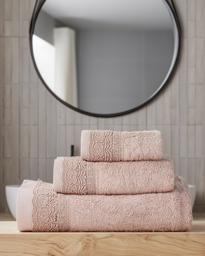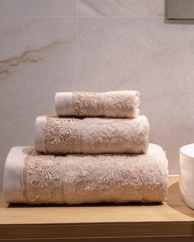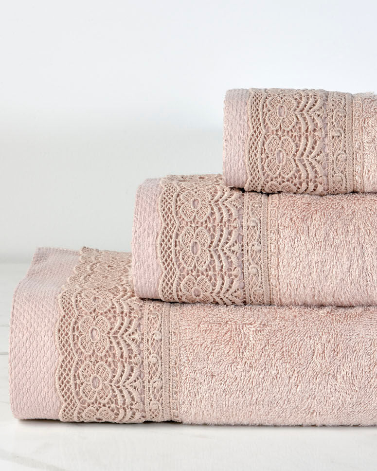 Set peshqirësh elegant me dizajn romantik dhe të rafinuar, ideal për të shtuar një prekje luksi në çdo banjo. I përbërë nga tre pjesë me madhësi të ndryshme, ( peshqir duarsh 30x50, peshqir fytyre 50x90 dhe peshqir trupi 70x140 ), ky set dallohet për dantellën dekorative fine që i jep një pamje klasike dhe delikate.