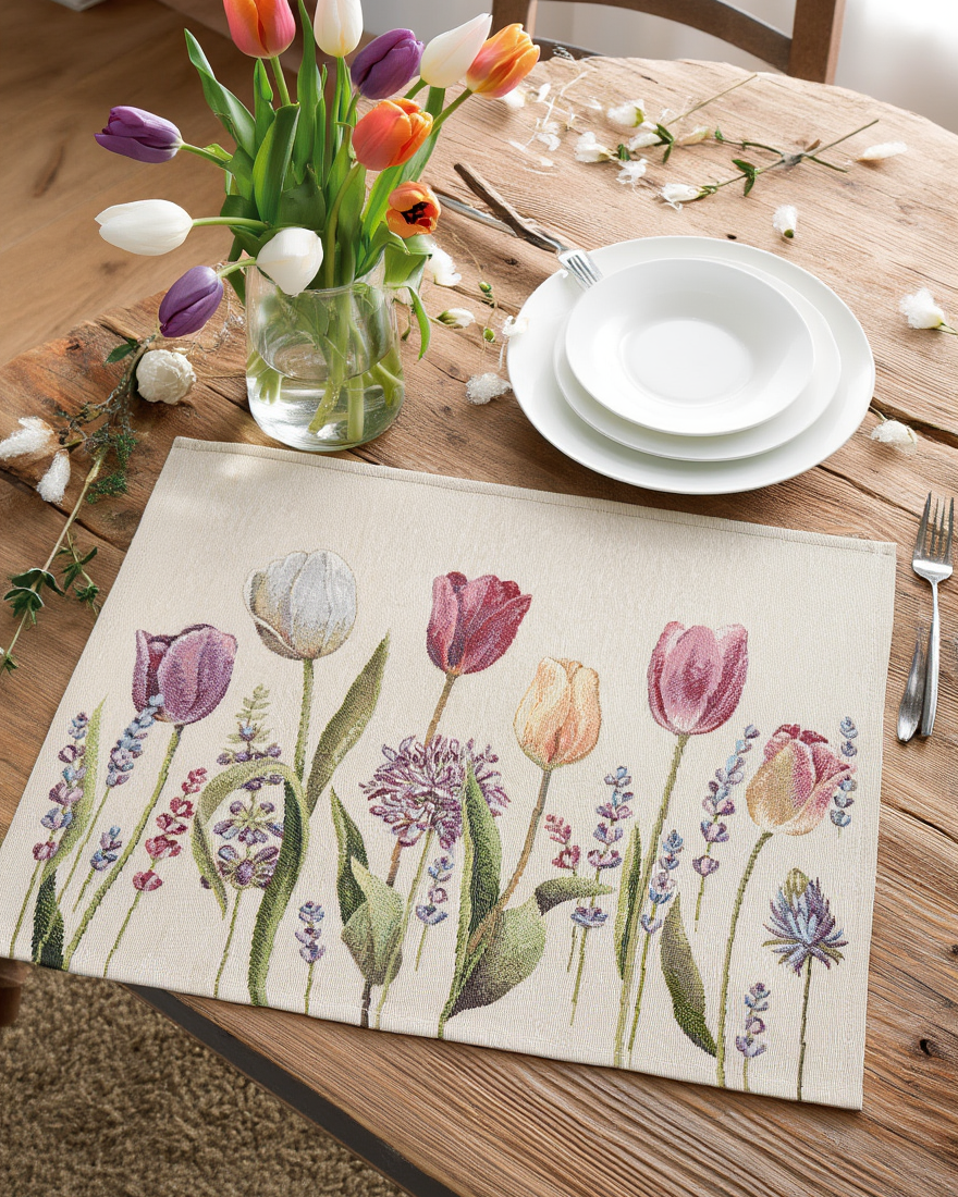 Shtresë tavoline dekorative me motive elegante tulipanësh dhe lulesh pranverore, e punuar me pëlhurë cilësore jacquard. Dizajni i saj shumëngjyrësh sjell freski dhe gjallëri në tryezë, duke krijuar një atmosferë të ngrohtë dhe pranverore. Ideale për përdorim të përditshëm ose për të dekoruar tryezën në raste festive.
